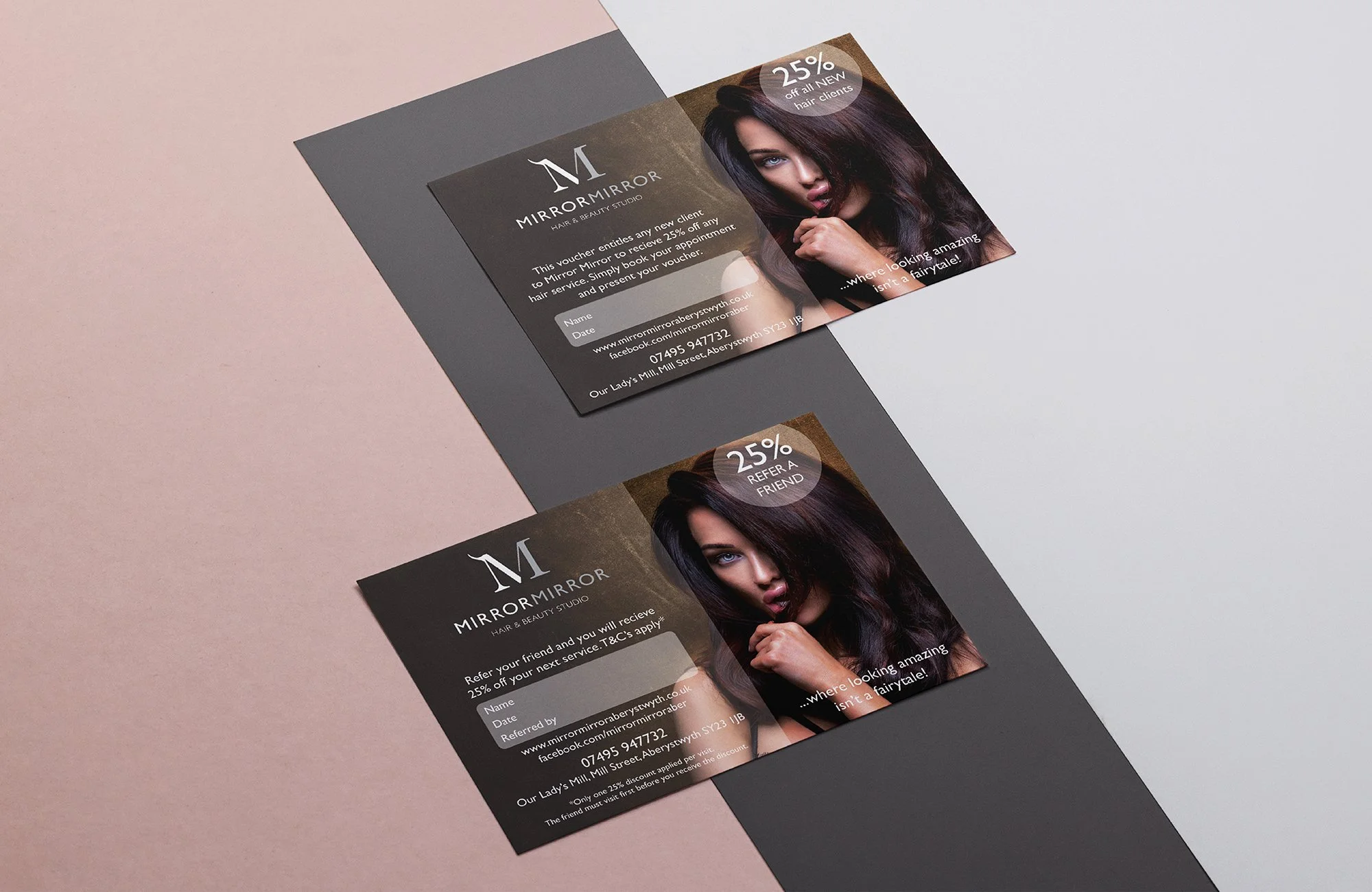 MIRROR MIRROR Offering a full range of hair and beauty treatments, Mirror Mirror is a beauty salon in Aberystwyth. A logo was created and applied to branding on all appointment cards, vouchers, pricelists and signage.